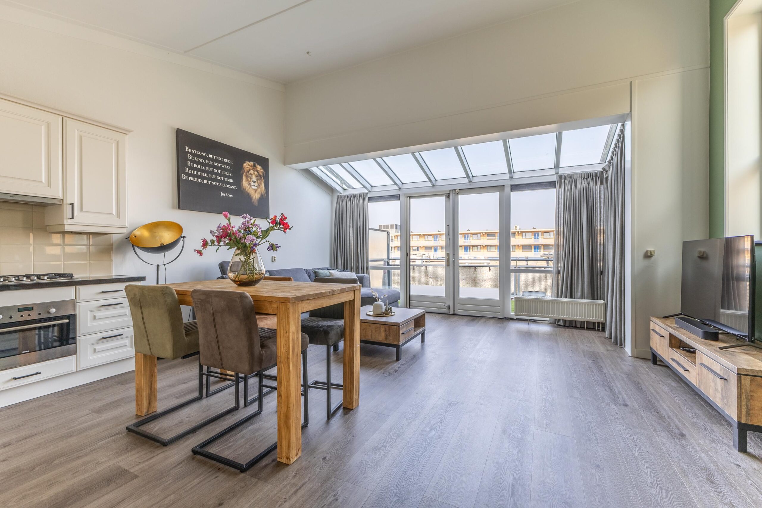 Een verdieping hoger kom je bij het toilet en de lichte woonkamer met open keuken. Dankzij de grote glaspartijen aan de achterzijde is dit een heerlijk lichte ruimte. De moderne L-vormige keuken is voorzien van alle gemakken en op de vloer ligt onderhoudsvriendelijke pvc. Via de openslaande deuren stap je zo het royale dakterras op: dé plek om na een drukke dag van de zon te genieten.