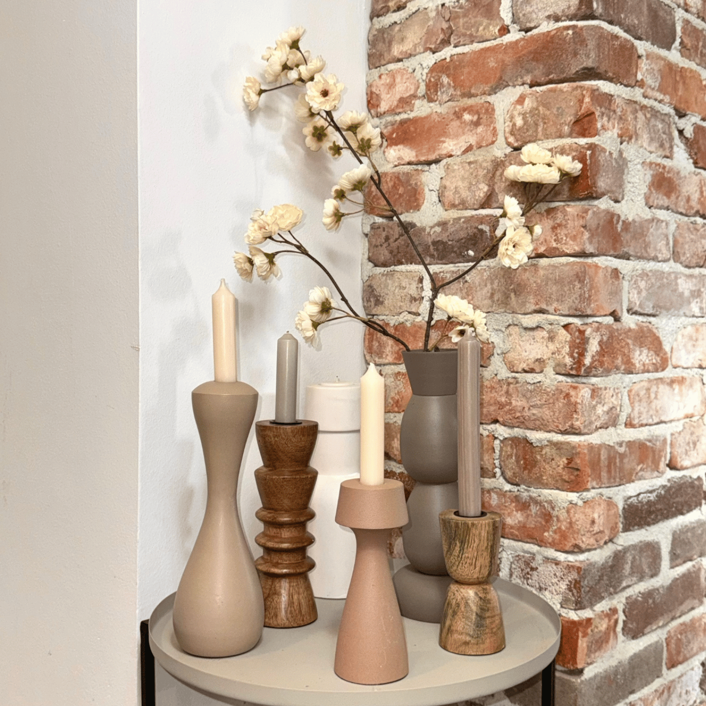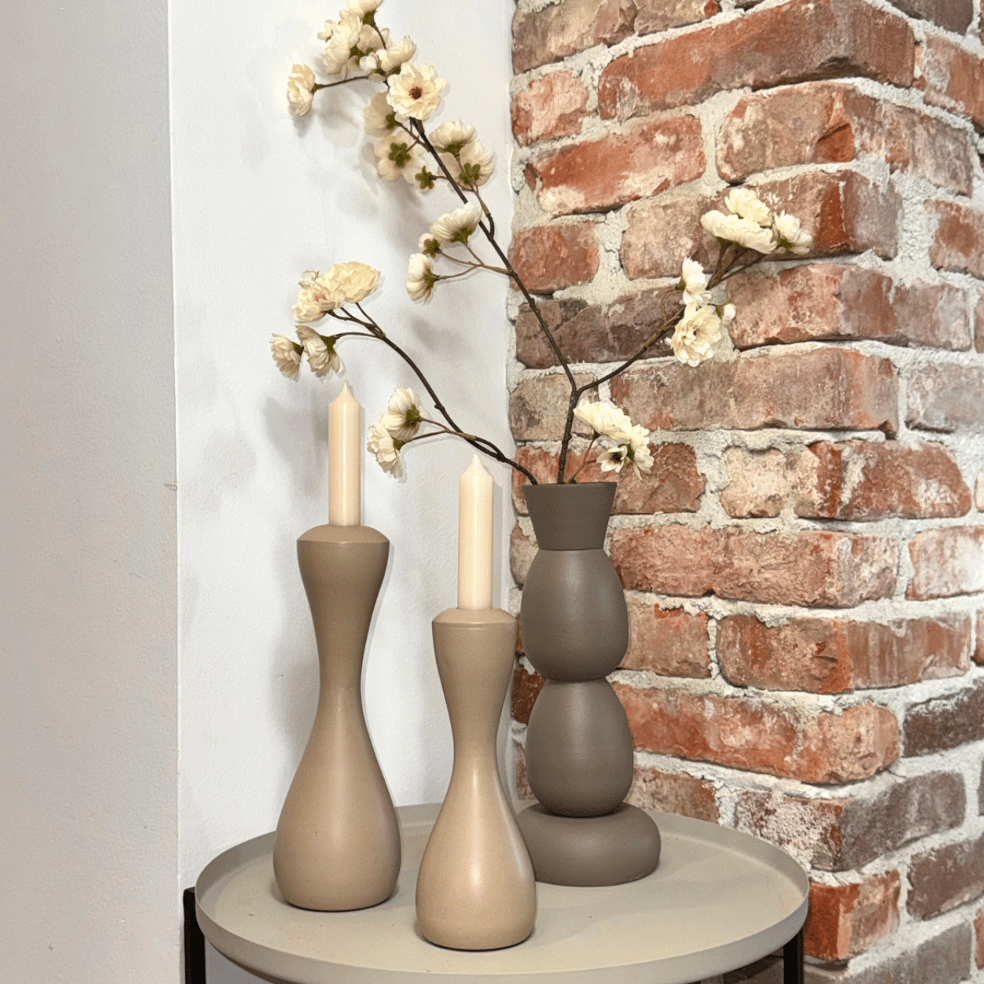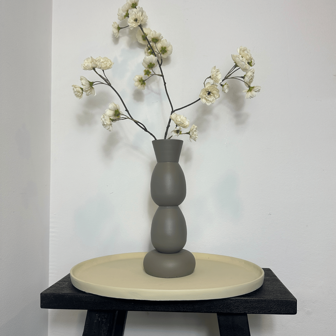 Dankzij de neutrale tint combineer je hem moeiteloos met hout, linnen, keramiek en andere natuurlijke materialen. Denk aan een licht houten tafel, een zandkleurige muur of een zwart accent voor contrast. In een rustig interieur zorgt deze vaas voor diepte. In een strakker geheel voegt hij warmte toe.