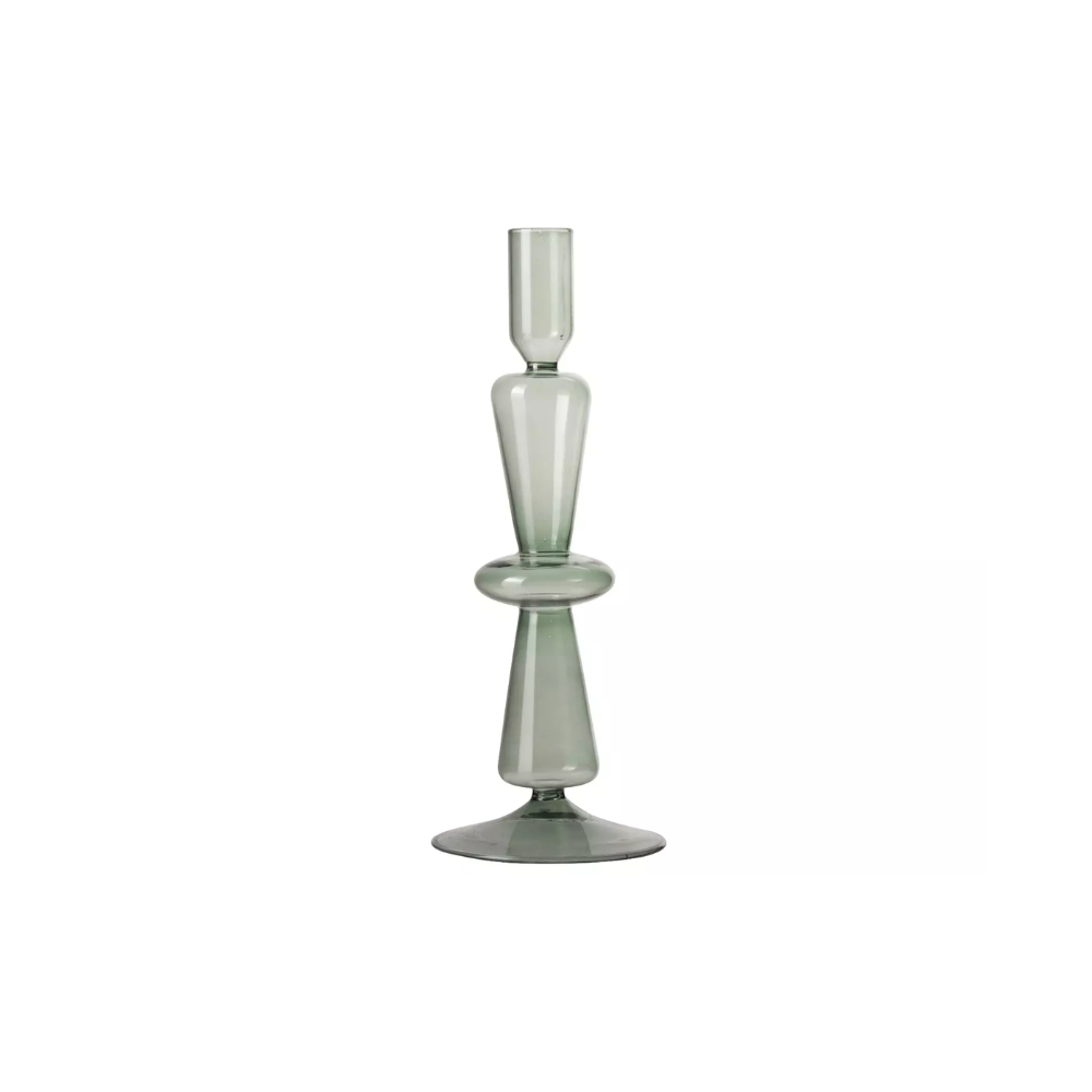 De kaarshouder is gemaakt van glas in een groene kleur. De diameter is 9 cm en de hoogte 25 cm. In de houder passen dinerkaarsen.